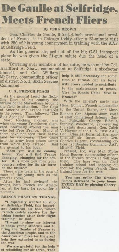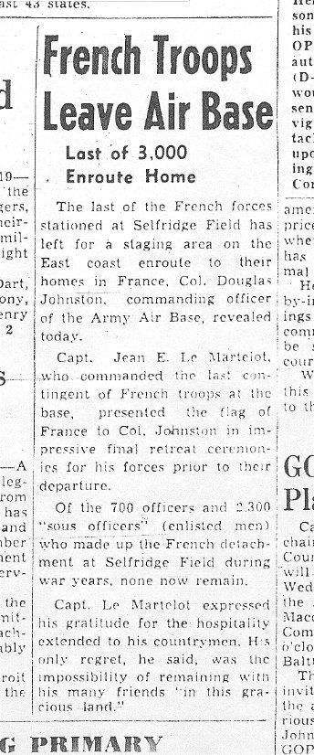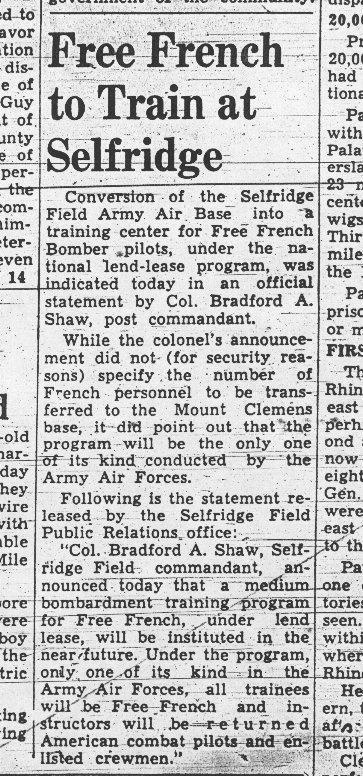 - 20 Mars 1945 : "Free French to Train at Selfridge" (p1, col 7).