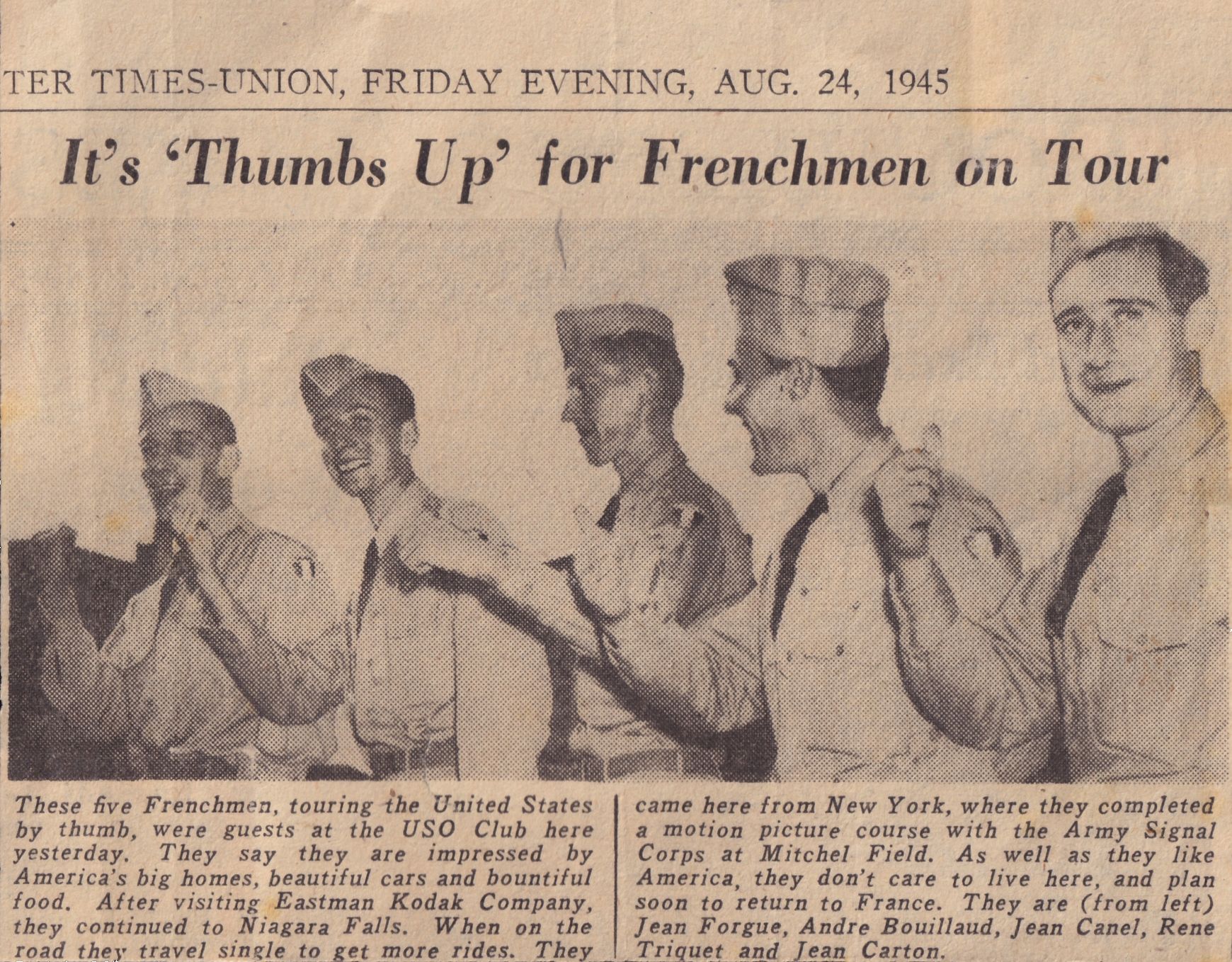 - 24 Août 1945 : It's 'Thumbs up' for Frenchmen on Tour (Jean Forgue, André Bouillau, Jean Canel, Jean Carton).
