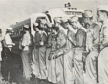 Après avoir stationné quelques heures à Newport News, départ pour un interminable trajet de deux jours et deux nuits en train. Destination Selma (Al) importante base école de l'USAAF destinée à la formation de base des cadets. Pour les jeunes Français il faudra plutôt parler de transformation. Une première bonne nouvelle les attend à leur arrivée: la perception de leur première solde en $US. Variable en fonction de leur grade, elle représente en moyenne 2 500 francs français de l'époque (soit 5 fois plus que la solde perçue en France).