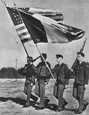Et, naturellement, les Français se sont tout de suite distingués, comme toujours. Les Français arrivant dans un coin, çà met tout de suite le "bintz", comme on dit. Il y avait un truc qui pesait beaucoup aux Français. C'était le matin. A 6 heures, aussitôt après le réveil, il fallait aller à la cérémonie du drapeau. Obligatoire. Au milieu de la petite base il y avait deux mâts, et tous les matins, il fallait aller monter les deux drapeaux, français et américain. Evidemment, du côté américain, tous les cadets étaient là, mais du côté français quelle bagarre ! Il fallait se lever pour aller au drapeau, et ça, c'est quelque chose. Alors, ils se sont fâchés. L'officier de discipline a commencé à la trouver saumâtre, et tous les matins, il passait dans les chambrées pour vérifier qu'il n'y avait plus personne dans les lits. Alors là,c'était très drôle, parce que du côté américain, tous les cadets étaient au drapeau et personne dans les lits et du côté français, il y avait trois ou quatre pelés qui étaient là, mais personne dans les lits non plus. Les Français déployaient des ruses de Sioux et faisaient des efforts bien supérieurs à ceux d'aller au drapeau, pour ne pas y aller. Ils se cachaient dans les greniers, derrière les portes, dans les armoires, etc. C'est inouï, ça. Ca a toujours intrigué les Américains. Ils n'ont jamais compris ça.