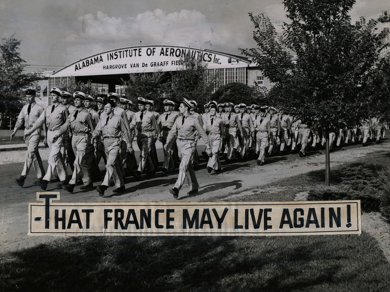 Août 1943 : Le 2ème détachement CFPNA défilant devant les installations de l'ALABAMA INSTITUTE OF AERONAUTICS Inc (Hargrove VAN De GRAAFF Field). (THAT FRANCE MAY LIVE AGAIN !) ![]()