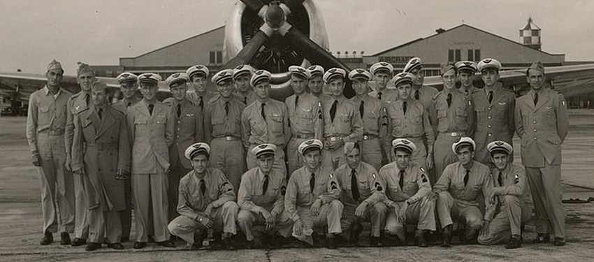 Dale Mabry (Floride) - 15 Mars 1944 . (De Gauche à Droite) Debout : Michel Mechineau - Roger Leboucher - Georges Billot - Jacques Allain - Robert Duguet - Rolland Hoche - Charles Baills - Jean Lacassie. Assis : Raymond Galibert - Louis Raoust - Lt Williams Mathews - Lt Felix.